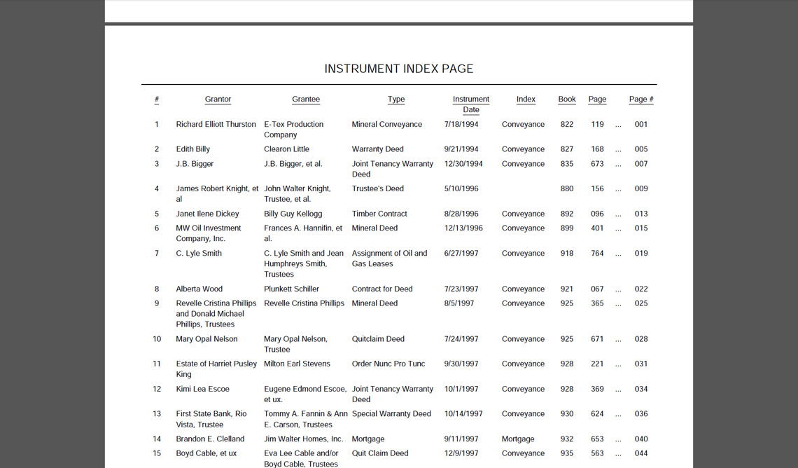 Our patent-pending Abstract Assembler takes the instrument records contained in a project and gives you the ability to compile those instruments into a secure PDF file for printing and binding or forwarding directly to a title attorney for examination.