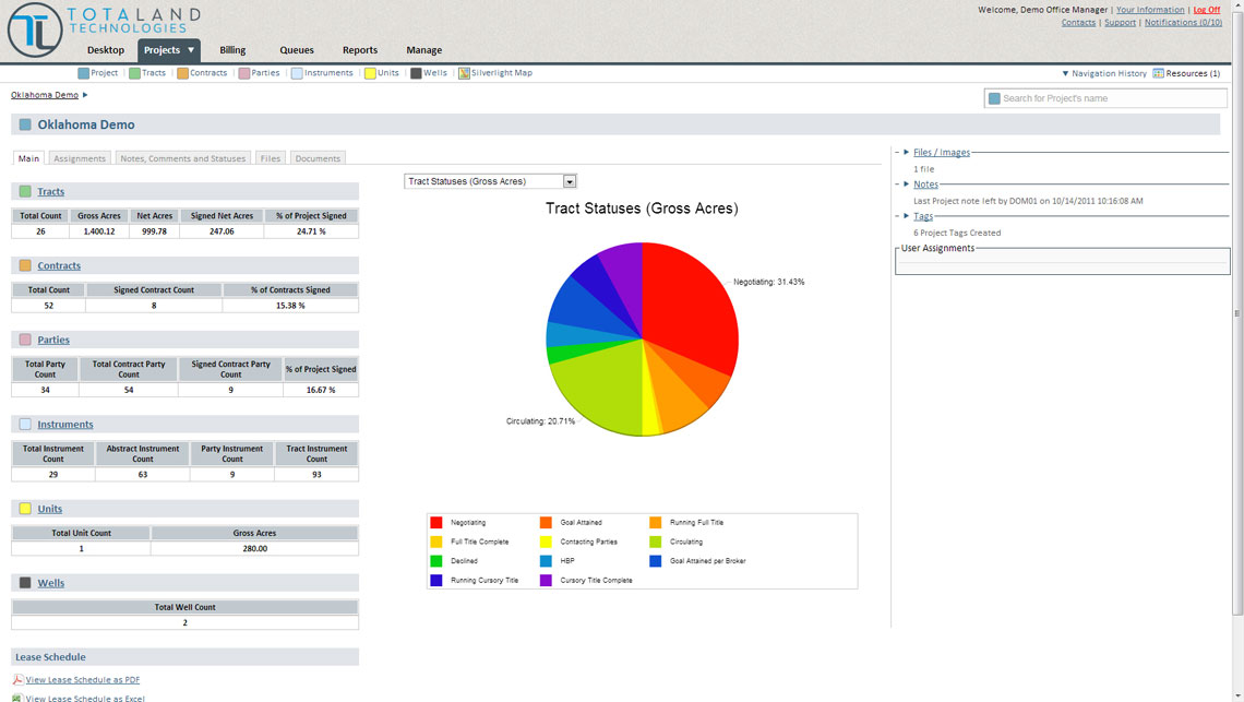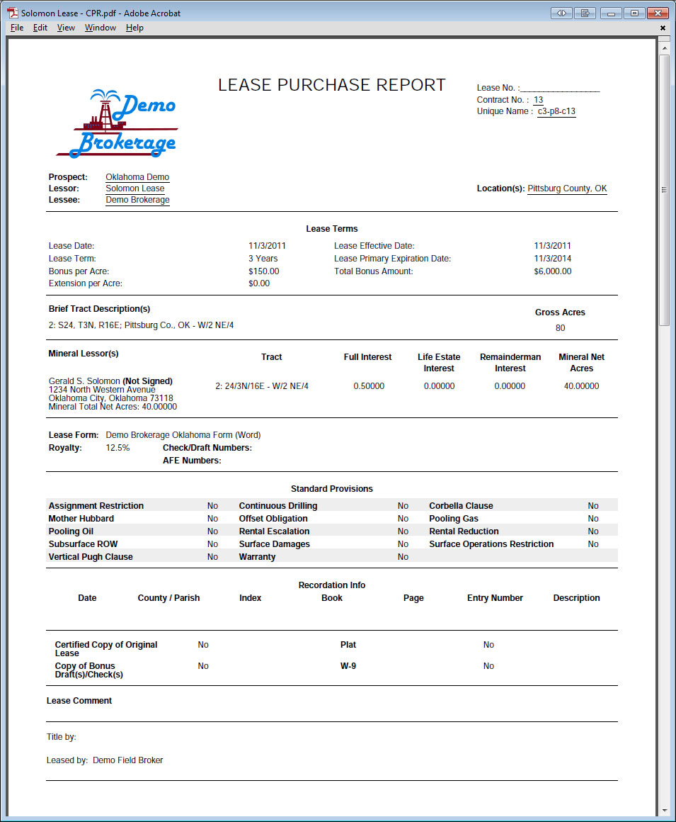 In TotaLand, “contract” refers to OGMLs, seismic permits, pipeline rights-of-way and similar documents. From a data standpoint, a contract contains critical information such as effective and expiration dates, type of form, dollar amounts per acre or rod, etc. With TotaLand, contracts are linked to tracts and parties as necessary, and even to instruments, units and wells.