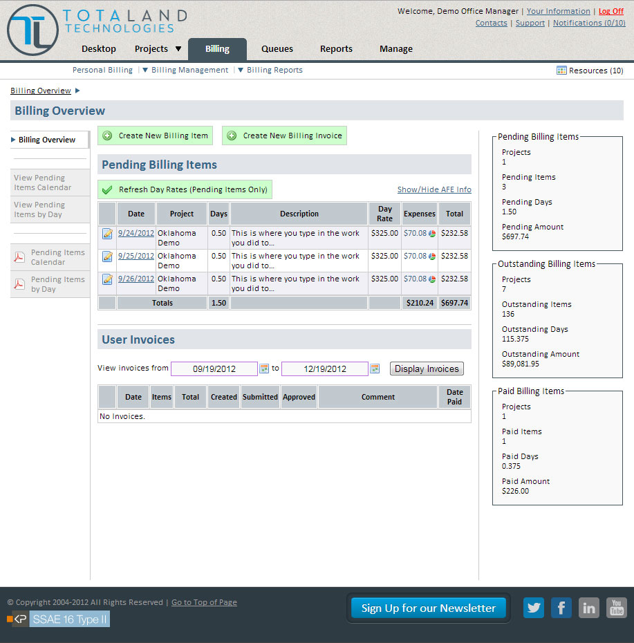 With TotaLand, brokers can do their billing in a snap. They can quickly complete daily billing items, attach scans of receipts if necessary and submit their invoices online. Broker billing data can optionally be processed into client invoices as well. You’ll be amazed at how much time TotaLand saves.